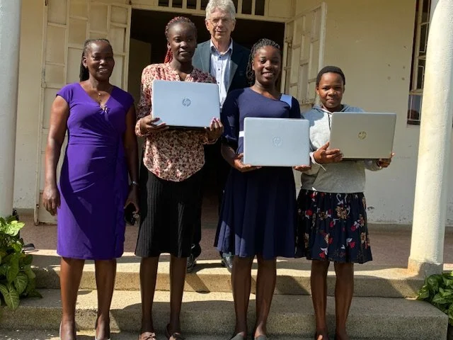 Sarah Nabongo, CES Kenya Administrative Assistant, with CES Canada Chair Carl Friesen, plus three of the Leadership Program students who received computers to do their work”