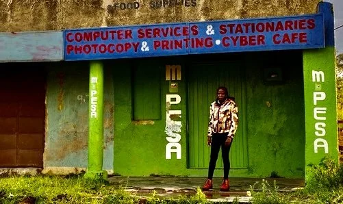 Patricia stands outside a cyber café in the city of Kakamega, Kenya. Cafes like this rent computers to students, literally by the minute. This can get expensive, but it’s still hard to find time on café machines particularly at busy periods in the academic year. The laptops CES provides to our Leadership students mean that these students can be more efficient in completing their assignments.
